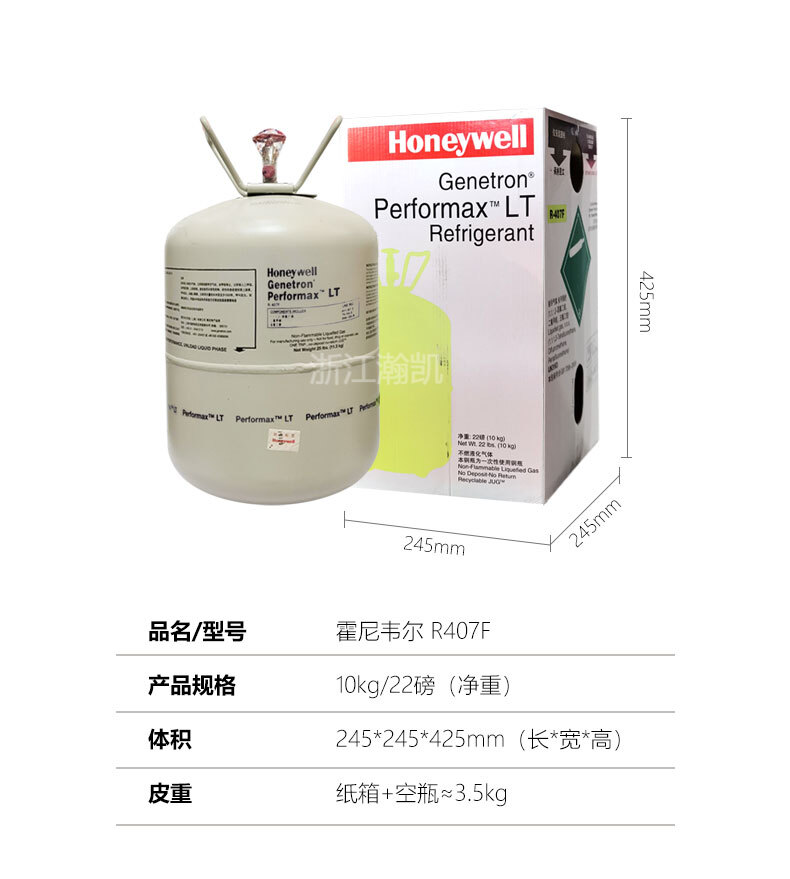 霍尼韋爾R407F制冷劑,商品名稱有 Genetron Performax® LT 制冷劑、R407F等,R407F屬于HFC型非共沸環(huán)保制冷劑(完全不含破壞臭氧層的CFC、HCFC),廣泛用于新冷凍設(shè)備上的初裝和維修過程中的再添加。